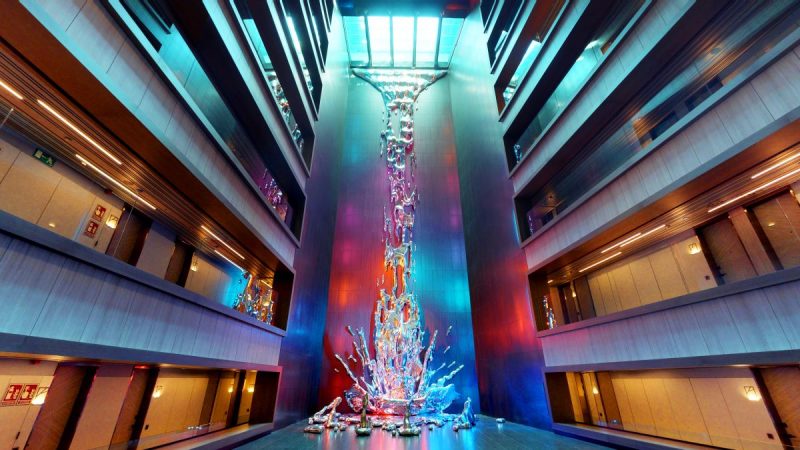 A parte de todos estos aspectos, el hotel alberga una impresionante colección de arte con más de 300 obras, incluyendo una instalación de Jan Hendrix inspirada en el ginkgo biloba en el lobby. Los clientes VIP pueden hacer un recorrido guiado por este pequeño museo, destacando artistas españoles contemporáneos como Darío Urzay y Nacho Zubelzu. La obra «The Waterfall» de Pere Grife preside el atrio, una espectacular caída de 8 pisos de altura desde la planta 12, donde se encuentra su piscina de fondo acristalado para que los huéspedes puedan observar la obra también desde allí.