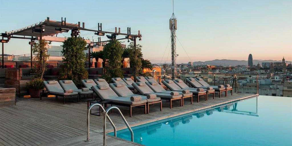 Uno de estos espacios se encuentra en la última planta del hotel, donde se ubica una espectacular piscina infinita cuyo horizonte se fusiona con los tejados del barrio barcelonés del Born, brindando unas vistas panorámicas incomparables de la Ciudad Condal. Esta parte no está abierta a todo el público, ya que es exclusiva para los huéspedes del hotel. Cuenta con un ambiente muy relajante de música chill out y cómodas hamacas, para disfrutar de un momento perfecto en lo más alto de la ciudad.