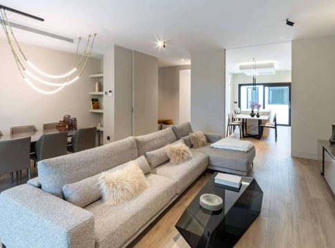 Un aspecto crucial del diseño interior es la atención a los detalles. La iluminación integrada en las distintas estancias, junto con puertas que se integran perfectamente en los muros y rodapiés a juego, contribuye a crear una sensación de ligereza y serenidad en todo el hogar. El mobiliario, seleccionado con sumo cuidado, es contemporáneo y elegante, complementando perfectamente la estética general del diseño y garantizando que cada espacio sea un oasis de armonía y confort.