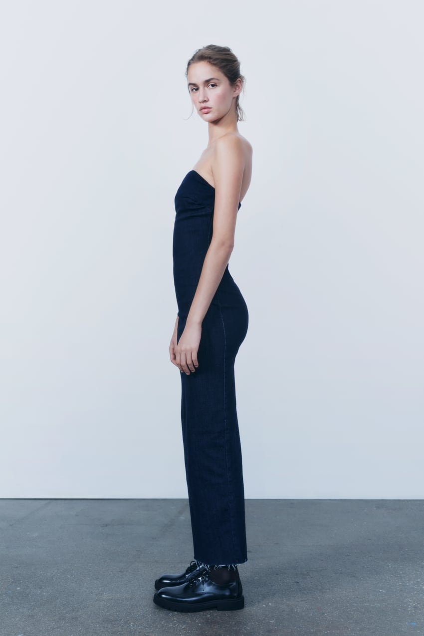 Con un escote recto y los hombros al descubierto, este vestido vaquero cuenta con un cierre en la espalda con cremallera oculta en la costura. Su forma es ideal para las chicas más bajitas, ya que al ser entallado crea un efecto de piernas infinitas que puede potenciarse aún más con unas buenas plataformas.