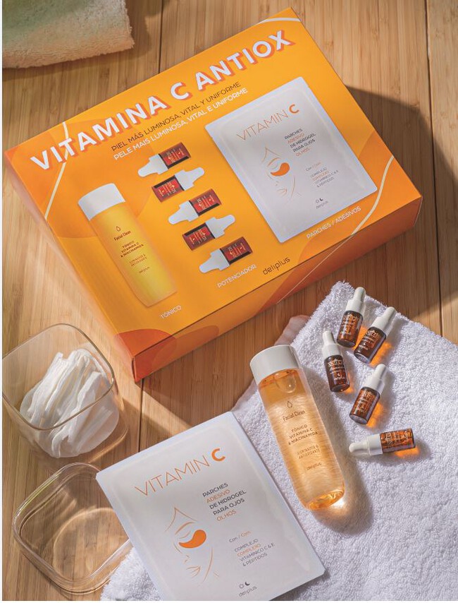 El lote incluye un tónico de 100 ml, 5 potenciadores de vitamina C de 3 ml cada uno y 2 parches de hidrogel para los ojos, que alivian la hinchazón y la fatiga en la zona de los ojos. El precio de este lote es de 8,50 euros.