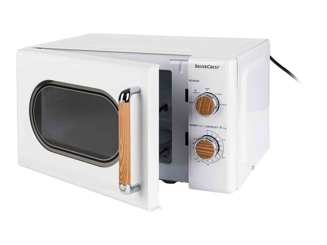 El microondas de Lidl es otro producto popular gracias a su diseño retro con elementos de imitación de madera. Tiene una potencia de 700 W, que es regulable en 5 niveles, de manera que puedes ajustar la intensidad para diferentes tipos de preparaciones. Además, cuenta con una útil función de descongelación.