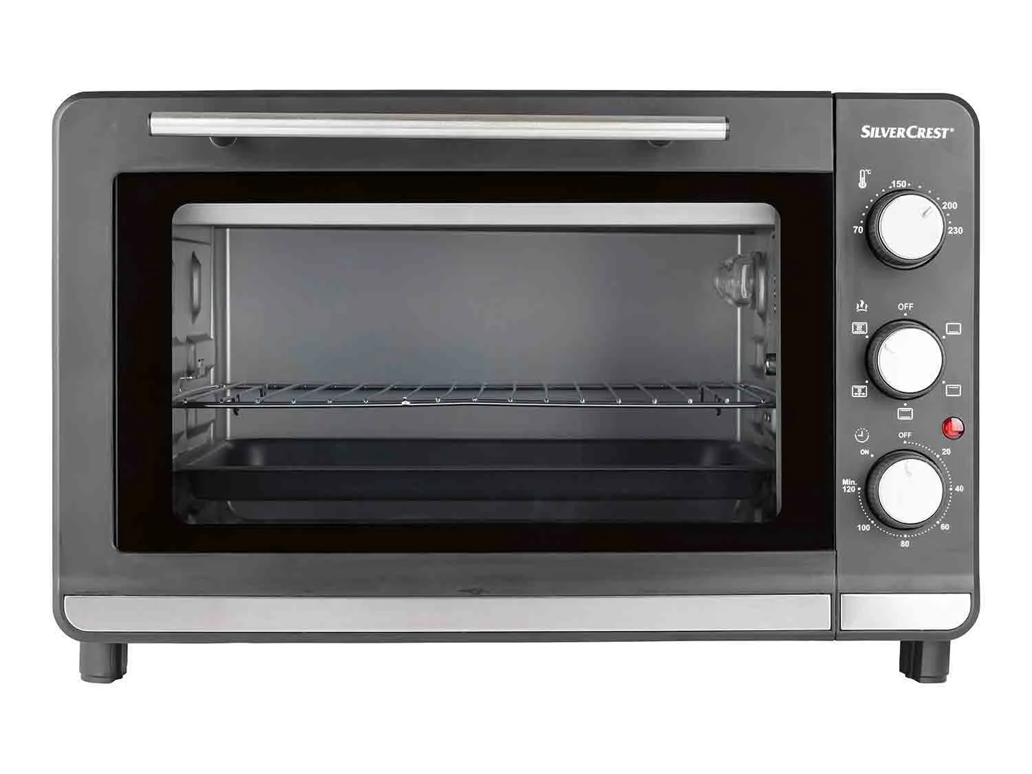 El horno eléctrico con grill de Lidl tiene todo lo que necesitas para cocinar, pero al tener un tamaño más pqueño el consumo es mucho menor. Tiene una potencia de 1500 W con regulación continua de la temperatura entre 70 °C y 230 °C. Puede operar en modo continuo o utilizar un temporizador programable de 120 minutos para cocinar tus alimentos de manera precisa.