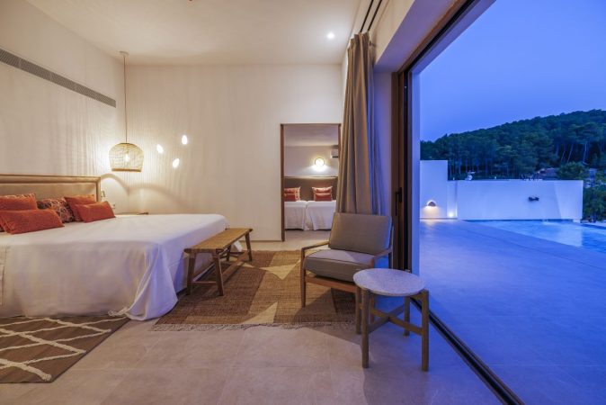 Garden Suites están formadas por espacios de más de 70 m2 de lujo y privacidad. Las vistas panorámicas al Puig d’en Jaume, es uno de sus principales atractivos, pero también se pueden contemplar jardines mediterráneos repletos de buganvilla, romero y lavanda. Poseen un dormitorio con cama de matrimonio 200×200, sofá cama, baño privado con raishower, patio con ducha exterior y zona de estar, además de terrazas y pérgola.