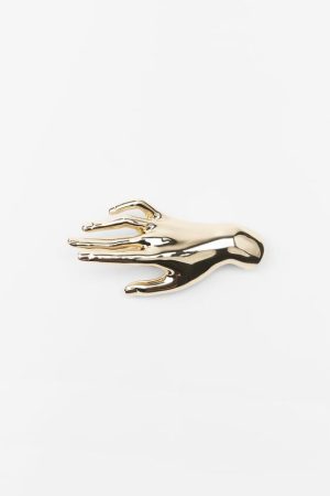 Entre las novedades que ofrece la firma de Inditex para la temporada de otoño e invierno, destaca un broche en forma de mano en relieve, bañado en un elegante tono dorado. Este broche se cierra con un imperdible y puede utilizarse para decorar tus prendas más sofisticadas o incluso para dar un toque especial a tu atuendo diario.