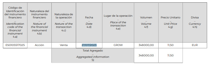 Volvamos a ese crucial 27 de julio, una fecha para enmarcar y que sirve para entender y comprender mejor el funcionamiento de posibles tergiversaciones al mercado de EiDF en este serial de comunicados a la CNMV. Aquel día, Fernando Romero vendió 348.000 títulos a un precio de 11,5 euros por acción. En total, 4.002.000 euros en ingresos. EiDF tiene en circulación 57,847 millones de títulos.