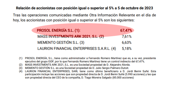 De esta forma y sin que EiDF haya presentado las cuentas, Prosol Energía no podía ni comprar ni vender acciones -se desconoce en qué fechas se ha producido la venta de ese 4,69% y el precio-, pero el mismo día 5 de octubre se dio a conocer una nueva posición significativa, con más del 5%, por parte de Laurion Financial Enterprises SARL, que ostenta concretamente el 5,18%. El mercado puede entender que la nueva posición significativa era una venta de acciones del máximo accionista. Demasiadas sombras sobre el cuándo se hizo y el precio al que se hizo.