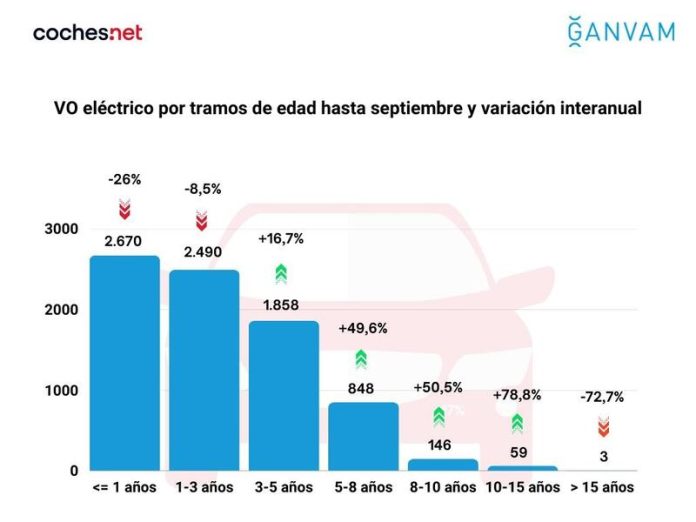 En un análisis por tramos de antigüedad, el 31% de los eléctricos de ocasión vendidos hasta septiembre tienen entre 3 y 5 años, lo que supone un incremento de casi el 17% con respecto al mismo periodo del año anterior.