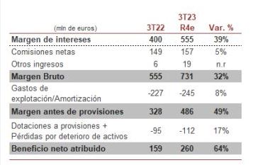 Por lo que respecta a las provisiones, «estimamos un aumento del +17% i.a. en 3T23, confirmando la tendencia al alza prevista y ajustada a la guía de coste de riesgo que tiene la entidad», señalan.
