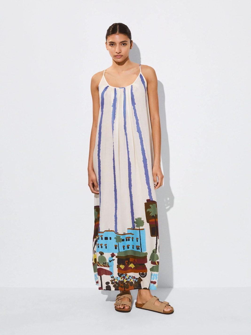 Con un estampado de lo más original en su parte inferior, este vestido largo nos ha parecido muy alegre y divertido. Con tirantes finos y líneas verticales de color azul que nacen en el escote, es muy favorecedor si quieres que tu silueta se vea más estilizada. Su largura hace que sea además un diseño muy cómodo y apto para cualquier evento, siendo ideal para las jornadas más relajadas. Precio: 27,99€.