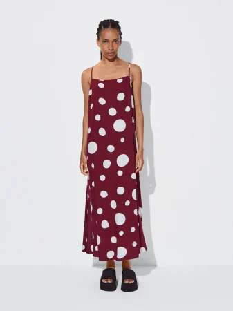 Corte recto y fluido es siempre sinónimo de comodidad y frescura. Con unos tirantes finos y en color burdeos, el toque original de esta prenda está protagonizado por su estampado de lunares blancos en diferentes tamaños. Cuenta con tirantes ajustables y un escote recto. Precio: 27,99€.