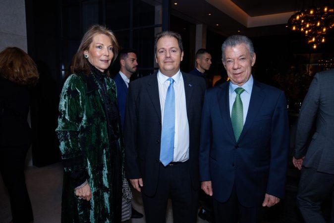 El presidente del PP, Alberto Núñez Feijóo (en el centro)Juan Manuel Santos junto a su esposa, María Clemencia de Santos, y acompañados de Alejandro Suárez Sánchez-Ocaña.