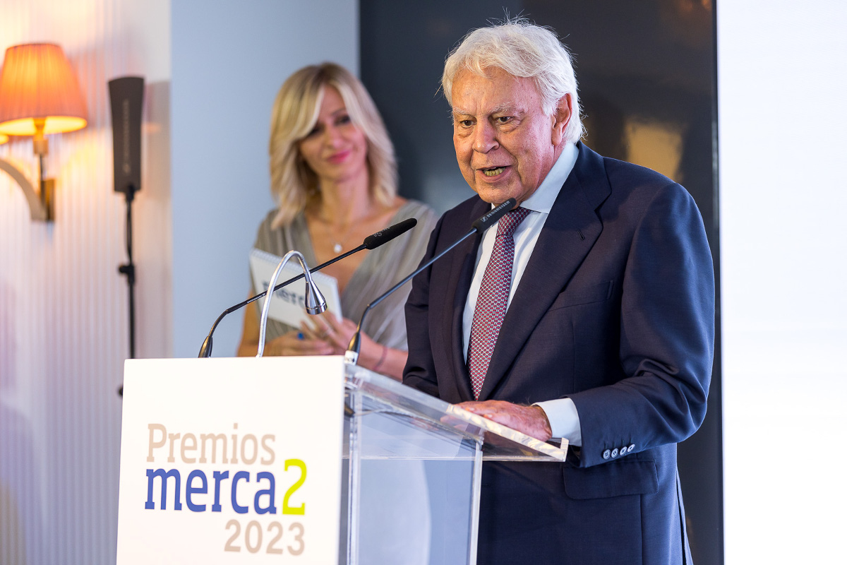 Albertó Nuñez Feijóo con todos los protagonistas de la película Campeonex.José Luis Bonet entregando el galardón a la Ministra de Educación y Formación Profesional.Todos los galardones de la cuarta edición de los Premios Merca2.Susanna Griso junto a Alejandro Suárez Sánchez-Ocaña y Ricardo Ducazcal.Glez Besada posa con Alejandro Suárez Sánchez-Ocaña.Maria Jesús Luengo, Directora de la Oficina de Presidencia de la Cámara de Comercio de España.Pilar Alegría sentada con José Luis Bonet, Presidente de la Cámara de España.Eugenia Martínez de Irujo junto a Tina y Mala, agentes caninas jubiladas de la Guardia Civil, y Pedro García, suboficial de la Guardia Civil.La Duquesa de Montoro junto a Tina, Agente Canina jubilada de la Guardia Civil especialista en detección de cocaína y dinero.José María García, precursor de la radio deportiva en Cadena Cope.Felipe González, ex-presidente del Gobierno España dando unas declaraciones a Merca2.El Delegado de Negocios TV, José Antonio Vizner entrega el galardón Acción Social a Marc Simón, Subdirector de La Caixa.El CEO de Grupo Merca2 posa junto a José Luis Bonet.Raúl del Pozo junto al galardonado José María García.María González Romero, Secretaria de la Fundación Felipe González, junto a su padre, el mismo Felipe González. Premio Especial Progreso e Igualdad de la Fundación Marqués de Oliva.José Luis Martínez-Almeida le entrega el galardón a Juan Manuel Moreno Bonilla.El Alcalde de Madrid, José Luis Martínez-Almeida.Las palabras del ex presidente del Gobierno de España ante la atenta mirada de la presentadora Susanna Griso.Felipe González le entrega el Premio Internacional de la Fundación Marqués de Oliva a Juan Manuel Santos.Juan Manuel Santos es uno de los colombianos con más amplia trayectoria en la vida pública de su país y mayor reconocimiento internacional.