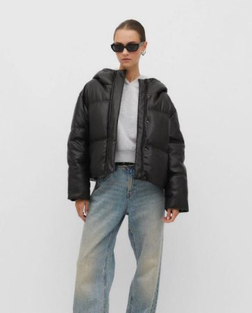 También de efecto piel, combinando elegancia con rebeldía, un plumífero con manga larga, cuello subido y capucha. Un diseño con bolsillos en los laterales con cierre de botón a presión y un cierre con cremallera oculta en la parte frontal. Es una elección versátil que se puede combinar con pantalones vaqueros de pernera ancha y zapatillas deportivas.