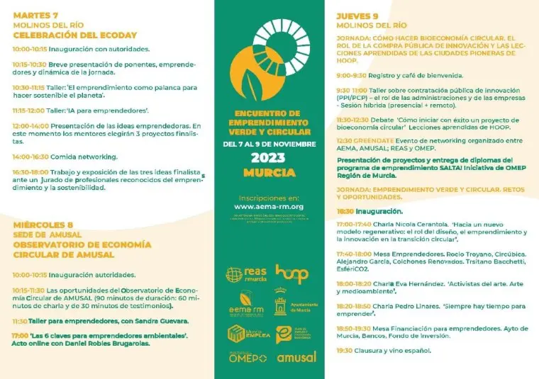 Murcia acogerá el Encuentro Emprendimiento Verde y Circular 2023. Los próximos 7,8 y 9 de noviembre, la Asociación de Empresas de Medio Ambiente (AEMA), organiza en virtud del convenio suscrito con el Ayuntamiento de Murcia dentro de las actuaciones del Plan Municipal de empleo y Promoción Económica el Encuentro de Emprendimiento Verde y Circular