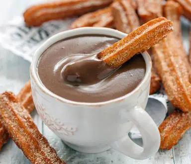 La opción clásica y tradicional. El chocolate caliente espeso es perfecto para mojar tus churros y disfrutar de la combinación de sabores.