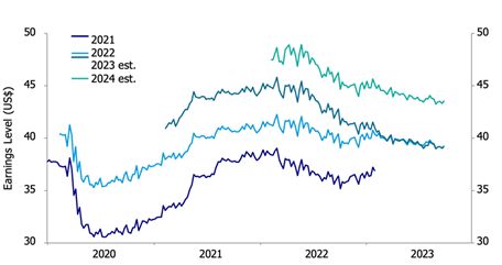 Prevemos una recesión de beneficios a medio plazo. Dicho esto, las empresas podrían encontrar la manera de superar los retos y seguir aumentando sus beneficios a pesar de la debilidad económica y la subida de los tipos de interés.