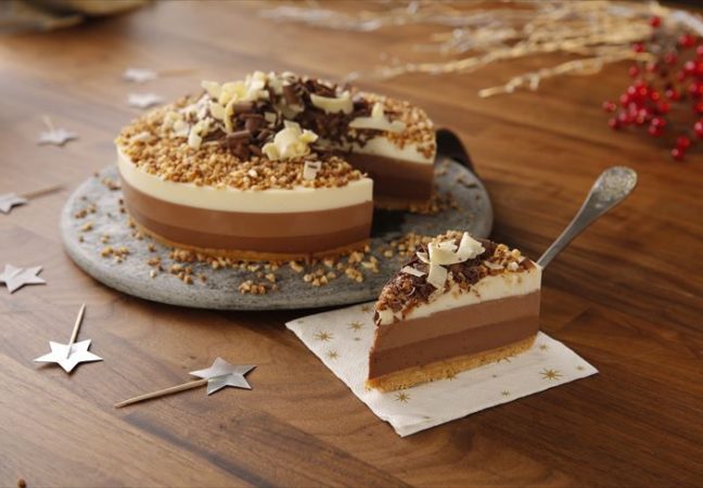 - ¡Es hora de disfrutar de tu deliciosa tarta de galletas y queso a los tres chocolates! Corta un trozo y sorpréndete con la explosión de sabores.