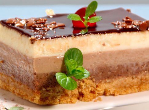 La tarta de galletas y queso a los tres chocolates es un verdadero festín para los amantes del chocolate. Cada capa, desde la base de galletas hasta el relleno de queso y las coberturas de chocolate, se mezcla de manera armoniosa para crear una experiencia de sabor excepcional.