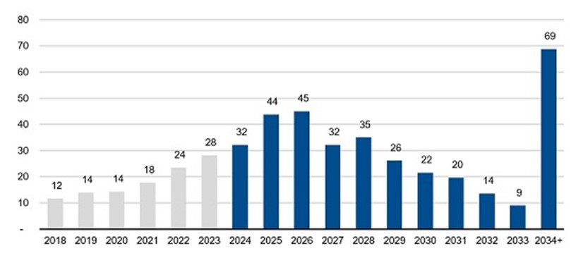 El sector europeo se enfrenta en 2024 al vencimiento de bonos por un importe total de 32.000 millones de euros, según Bloomberg. Esa cantidad aumenta en más de un tercio, hasta 44.000 millones de euros, al año siguiente, incrementándose de nuevo a 45.000 millones de euros en 2026 antes de volver a caer a 32.000 y 35.000 millones de euros en 2027 y 2028, respectivamente. El sector también tiene una considerable deuda a largo plazo que refinanciar en 2034 y años posteriores.