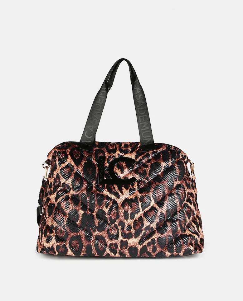 Esta elegante bolsa de viaje es la elección perfecta para tus escapadas con estilo. Es un producto de la marca Lola Casademunt y destaca por su diseño acolchado con estampado de animal print y un logo grande lacado. La bolsa está equipada con asas de hombro que presentan el logotipo de la marca, así como una asa bandolera ajustable y desmontable para mayor comodidad. El cierre de cremallera asegura tus pertenencias, y en su interior, encontrarás bolsillos y compartimentos prácticos para mantener todo organizado. Además, cuenta con un bolsillo trasero diseñado para sujetarla a una maleta. La bolsa está fabricada en su totalidad con poliéster al 100%. Sus dimensiones son de 33 cm de alto, 46,5 cm de largo y 21,5 cm de ancho. Todo esto viene con un precio reducido a 104,30 euros, en El Corte Inglés.
