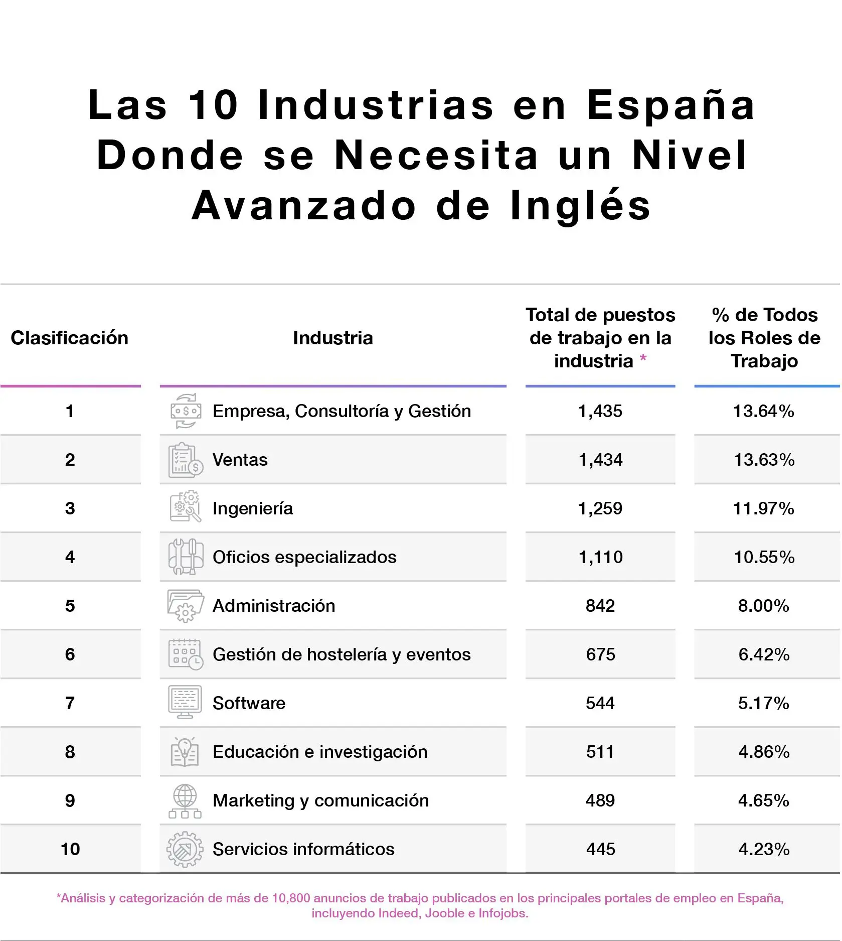El sector de negocios, consultoría y gestión se posiciona como el primero en el ranking, con más de un 14% de empleos que requieren conocimientos de inglés. Combinados con el sector de ventas (14%), constituyen casi un tercio de todos los puestos analizados en el estudio (28%). La ingeniería (12%) y los oficios cualificados (11%) ocupan el tercer y cuarto puesto, con más de una quinta parte del estudio. Estos resultados subrayan el valor del dominio del inglés, incluso para quienes tienen formación técnica. Sorprendentemente, sectores como la hostelería (6%), el marketing (5%) y la educación (5%) muestran una menor demanda de profesionales de habla inglesa.