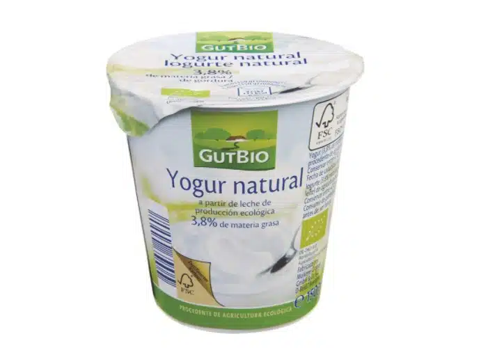 El último producto de la lista es este yogur natural que se vende en el supermercado. De la mano de Gutbio, tiene la particularidad de no tener añadidos, siendo únicamente yogur natural procedente de la agricultura ecológica. De este modo, solo contiene leche y los fermentos necesarios para que se haga yogur.