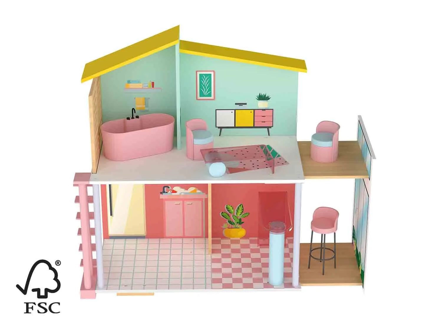 La casa de muñecas de madera es un juguete que estimula la fantasía y la capacidad de adoptar distintos papeles. Esta casa de muñecas tiene dos plantas y una terraza extensible, con una estructura estable de madera y amplias zonas de juego. Viene con 7 accesorios de madera y plástico para la cocina, el baño y el salón, así como una escalera de uso versátil. Es apta para jugar con muñecas maniquí de 30 cm de altura y es recomendada para niños a partir de 3 años. Todo esto por un precio de 17.99 euros.