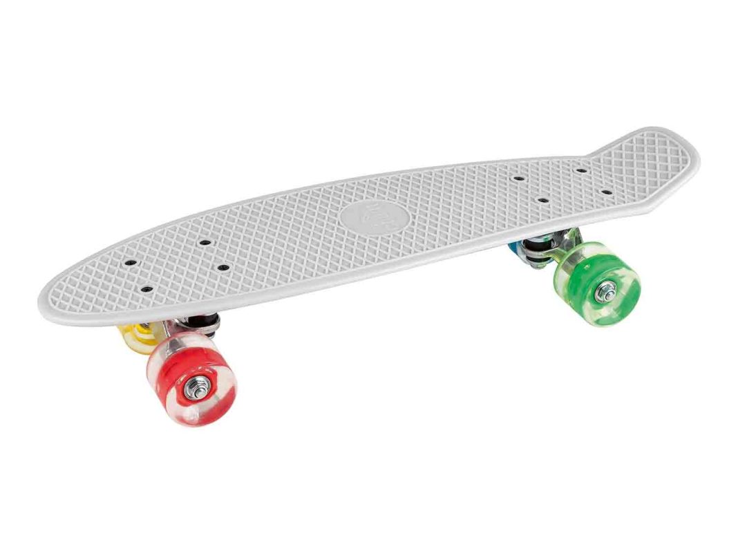 El monopatín Penny con ruedas LED es una opción rápida, dinámica y ligera ideal para desplazarse por la ciudad. Cuenta con una plataforma de un solo click con superficie antideslizante y rodamientos de bolas ABEC 7 de alta calidad. Las ruedas miden 60 x 45 mm y tienen un nivel de dureza de 78A para un deslizamiento suave. Además, cada rueda tiene tres luces LED. El monopatín está disponible en dos colores, gris y turquesa, y puede soportar hasta 100 kilos. El precio es de solo 12,99 euros.