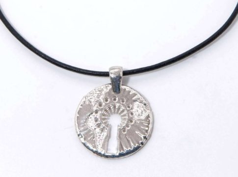 Realizada en Plata de Ley, la medalla está disponible en dos tamaños con distintos acabados: plata brillo, plata oxidada y bruñida con diamantes, y se acompaña de cordón de cuero y cierre de plata de ley. Según demanda del cliente, se puede regalar en oro blanco o amarillo, con diamantes o zafiros, con cadena o personalizada con grabado.