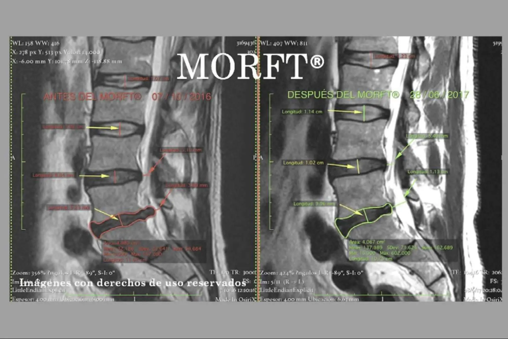 Al final del tratamiento, se puede visualizar, a través de imágenes comparativas de resonancias magnéticas realizadas antes y después del MORFT®, la recuperación del espacio vertebral, la descompresión del disco, con diminución del perímetro invasor caracterizando la regresión discal activa. Todo eso acompañado de la reducción hasta la eliminación total de los dolores de manera totalmente natural, sin medicación, sin cirugía, ni procedimientos invasivos, logrando la recuperación funcional total y el reequilibrio de la biomecánica del paciente.