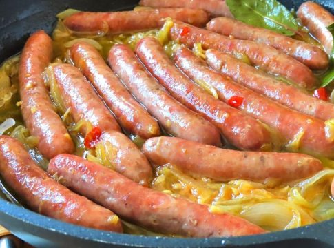 - Vuelve a colocar las salchichas doradas en la sartén.