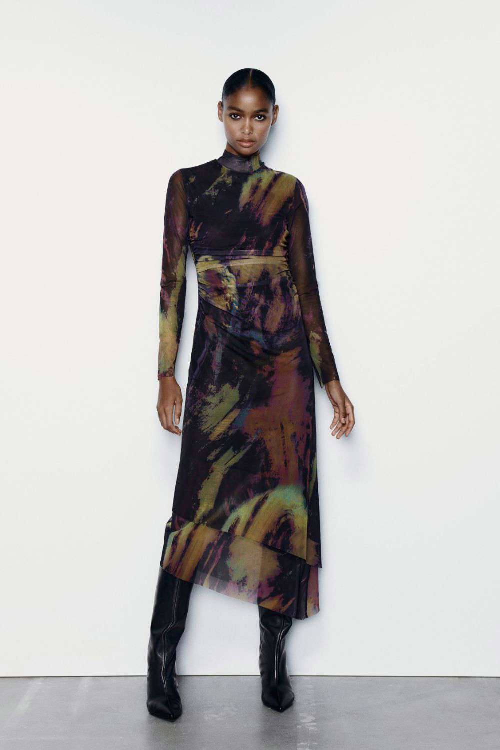 Si planeas agregar un nuevo vestido a tu colección de otoño/invierno de Zara, siempre es una buena idea optar por una prenda estampada que destaque entre tus opciones, especialmente si quieres conectar con tu lado boho-chic. ¡Aquí te presentamos los vestidos que marcarán tendencia este otoño! ¿Qué te parece este vestido de tul elástico con estampado tie-dye, cuello subido, cintura ajustada con drapeados y falda asimétrica doble? Un diseño súper original para el invierno, con manga larga. Este vestido de Zara tiene un precio de 25,95€.