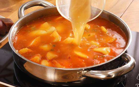 - Añade el Caldo de Pescado: Vierte el caldo de pescado caliente sobre las verduras y las patatas. Deja que el caldo hierva y luego reduce el fuego a fuego lento. Cocina hasta que las patatas estén tiernas y el caldo se haya reducido y espesado.
