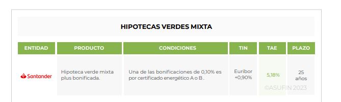 La entidad que ofrece una mayor bonificación en hipotecas ‘verdes’ «es BBVA, que rebaja un 1% TIN en sus hipotecas fijas, mientras que el ejemplo contrario es Banco Santander, cuyo descuento adicional es del 0,10%. Todas las hipotecas se centran en vivienda de calificación del tipo A o B», señalan.