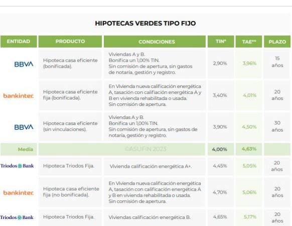 Según este informe, «este año, hay una mayor oferta de hipoteca verde en el mercado, con relación a 2022. Pasamos de cinco propuestas de dos entidades financieras, a nueve, ofrecidas por seis entidades, en estos momentos. También encontramos la primera hipoteca verde ecológica mixta por parte de Banco Santander».
