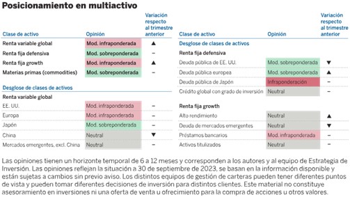 En términos generales, confían «en que el rendimiento de los activos de riesgo sea inferior al de la renta fija defensiva, dadas las elevadas valoraciones de los primeros y el efecto retardado pero inminente de la política monetaria restrictiva. No obstante, hemos reducido nuestro posicionamiento infra ponderado en la renta variable global y los diferenciales crediticios, y estamos bastante cerca de la neutralidad en el conjunto de nuestras ponderaciones activas».