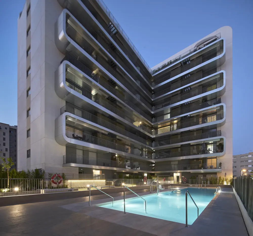 El estudio de Rafael De La-Hoz concibió este residencial con amplias zonas comunes, como su piscina solárium, que suponen un eje vertebrador de la vida en comunidad.