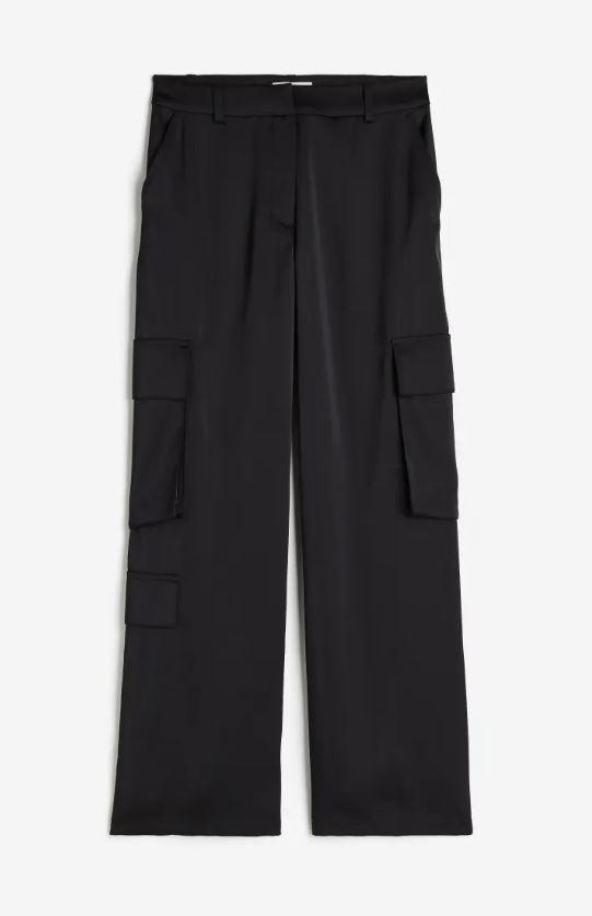 Negro. Estos pantalones satinados de cintura baja H&M, diseñados con sutileza y estilo, cuentan con prácticas trabillas para cinturón, ofreciéndote la posibilidad de personalizar tu look. La pernera ancha añade un toque de sofisticación, mientras que los dos bolsillos en un lateral y otro en la otra pierna aportan un atractivo equilibrio entre moda y funcionalidad.