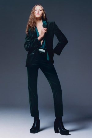 Para quienes buscan un toque de color y textura, existen alternativas como el traje de terciopelo azul o verde. El primero viene con un blazer de cuello solapa y pantalón acampanado, mientras que el segundo ofrece una chaqueta entallada y un pantalón recto tobillero. Ambos conjuntos, con un precio de blazer por 99,95 euros y pantalón por 49,95 euros, prometen añadir un toque de elegancia distintiva en cualquier ocasión.
