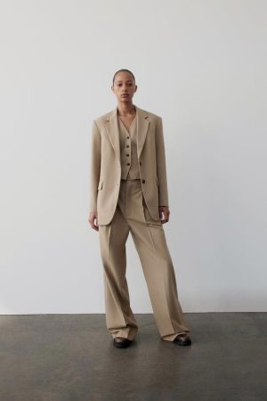 Zara no se limita a las siluetas clásicas y ofrece conjuntos más atrevidos como el traje de tres piezas en color beige. Este conjunto incluye un blazer de corte oversize, un chaleco tipo sastre y un pantalón de pierna ancha con pinzas, ofreciendo un estilo vanguardista por un total de 35,95 euros, 29,95 euros y 39,95 euros respectivamente.