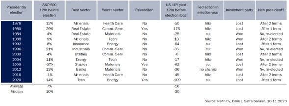 En consecuencia, el resultado más favorable es aquel en el que el presidente en ejercicio es reelegido y el banco central relaja su política monetaria. Este resultado es posible en 2024. Sin embargo, para lograrlo habría que evitar una recesión. En los últimos 50 años, el partido gobernante siempre ha perdido la Casa Blanca cuando se ha producido una recesión durante el año electoral.