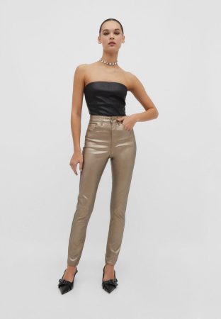 Entre los modelos más destacados de Stradivarius, el pitillo gris perla es uno de los favoritos, con un aire retro y totalmente en tendencia. Su tiro alto y acabado metalizado lo convierten en una pieza versátil apta para eventos nocturnos o planes informales de fin de semana. Combinarlo con un jersey corto y zapatos destalonados ofrece un look completo y chic.