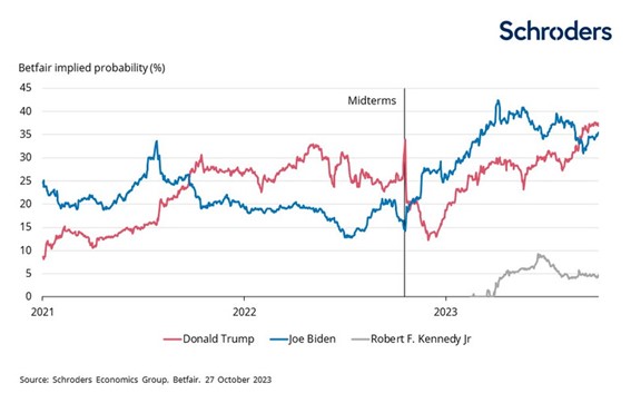 Biden tiene muchas razones para ser optimista sobre sus posibilidades de reelección. Además de la ventaja que supone su cargo actual, está supervisando una economía fuerte, un mercado laboral restrictivo y una inflación en franca desaceleración. El reciente conflicto en Israel también podría proporcionarle cierto apoyo, ya que el aumento de las tensiones geopolíticas ha provocado históricamente un efecto de «concentración en torno a la bandera».