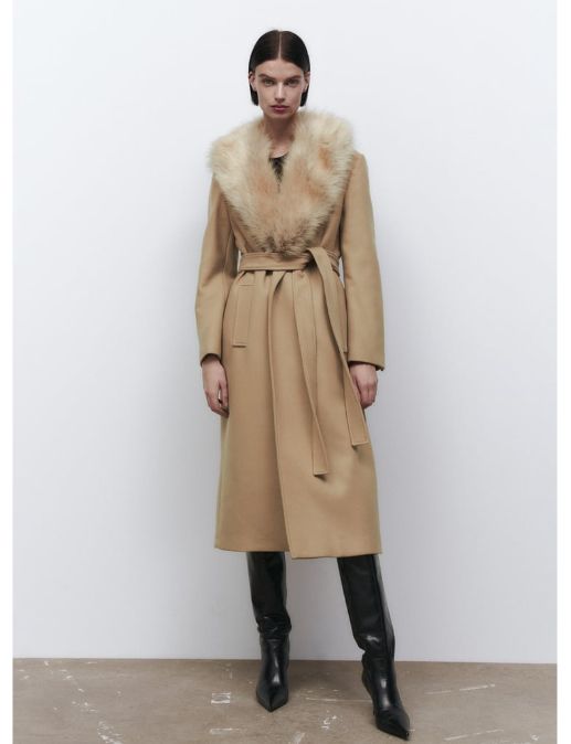 No puede faltar, ahora que llega el frío, un buen abrigo que proteja pero elegante, que por otro lado es perfecto para combinar con el pantalón anterior. Rezuma estilo, confeccionado con tejido en mezcla de lana, cuello solapa con detalle de aplicación efecto pelo extraíble combinado a tono, manga larga, bolsillos laterales, cinturón lazada en mismo tejido, tejido 100% by Italian Fabric, este es un tejido reciclable diseñado para garantizar altos estándares de durabilidad y forro interior combinado a tono. También tiene un 40% de descuento y su precio se queda en 83,40 euros.