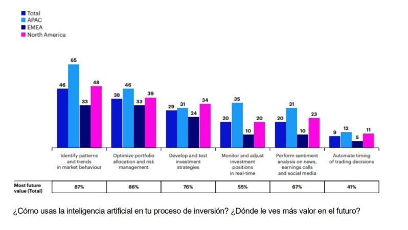 La mayoría (51%) de los inversores en EMEA creen que la IA seguirá siendo menos importante que los métodos tradicionales de análisis en diez años, en comparación con solo el (10%) en América del Norte y el (7%) en APAC