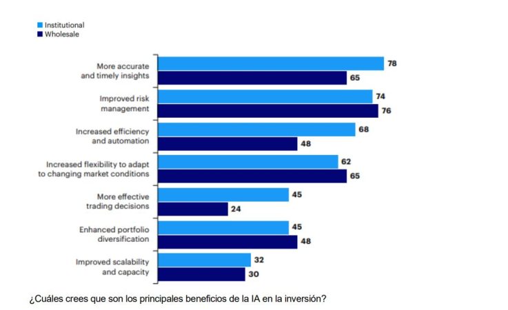 Los inversores mayoristas identificaron la mejora en la gestión del riesgo como el principal beneficio de la IA, citado por el (76%) de los encuestados, seguido por la flexibilidad para adaptarse a las condiciones cambiantes del mercado (65%). Sin embargo, persisten desafíos: los encuestados mayoristas citaron el costo de implementación (64%) y la complejidad e interpretabilidad de los modelos de IA (61%) como los principales obstáculos para la adopción.
