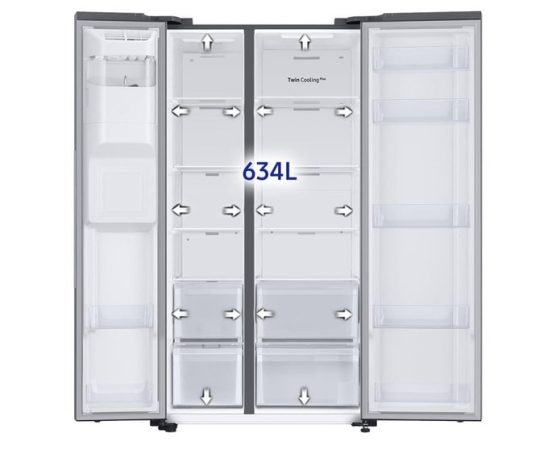 Con una capacidad útil de 409 litros en el frigorífico y 634 litros en total, este frigorífico ofrece un amplio espacio para almacenar alimentos de forma organizada. Sus múltiples estantes y cajones, fabricados con materiales de calidad como el cristal templado, permiten una distribución eficiente y práctica, facilitando el acceso a los productos almacenados.