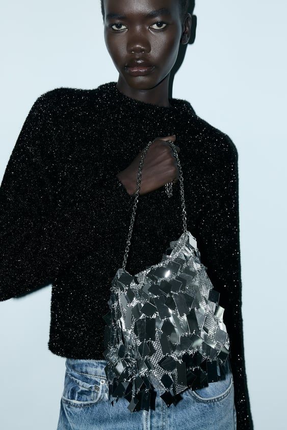 Completa tu look festivo con el elegante bolso saca metalizada de flecos en Zara, disponible por solo 39,95 EUR. Este encantador bolso en formato saca presenta un cautivador efecto metalizado, añadiendo un toque de brillo y sofisticación a tu atuendo navideño. Los flecos con abalorios tipo espejos proporcionan un detalle llamativo y único, mientras que el asa de cadena con función bandolera ofrece versatilidad en su uso.