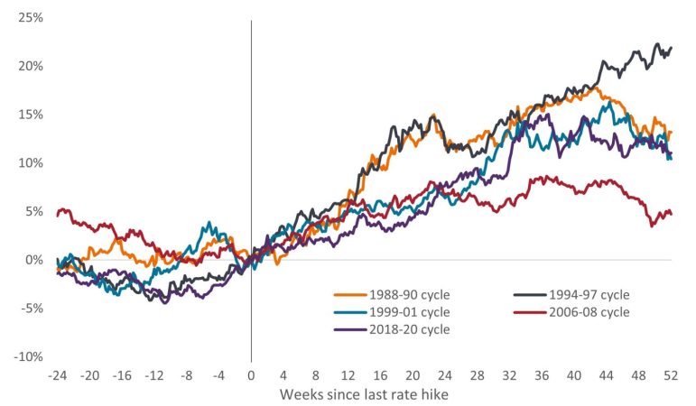 Las presiones salariales se están moderando y los mercados de futuros ya consideran que la Reserva Federal de EE.UU. (la Fed) ha dejado de subir los tipos de interés.2 Los resultados del pasado no son necesariamente una guía, pero la historia ha demostrado que los bonos del Estado suelen tener un buen comportamiento tras la última subida.